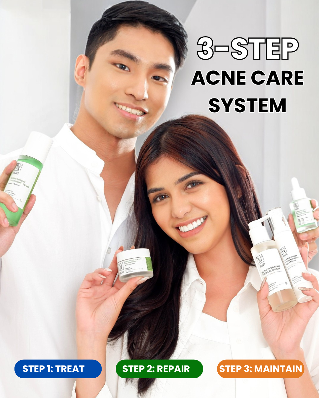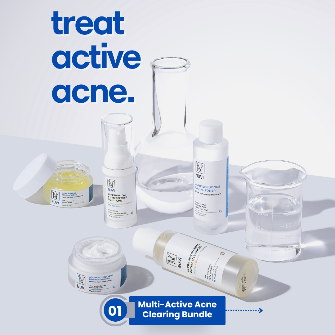 NUVI is an expert-led, FDA-approved acne care system designed to treat acne through clear steps—so you can control breakouts, repair skin damage, and maintain long-term skin clarity without stressing sensitive skin.